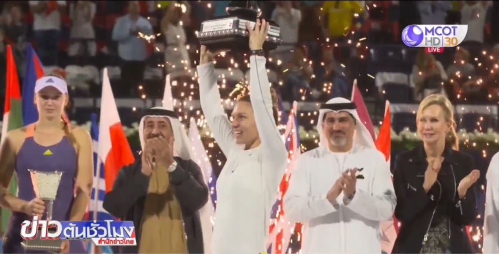 ศึกเทนนิสดับเบิลยูทีเอ ทัวร์ รายการ “ดูไบ ดิวตี้ ฟรี เทนนิส แชมเปียนชิพส์” ที่นครดูไบ ประเทศสหรัฐอาหรับเอมิเรตส์ หญิงเดี่ยว รอบชิงชนะเลิศ ซิโมนา ฮาเล็ป นักหวดสาวมือ 1 ของรายการจากโรมาเนีย เอาชนะ เอเลนา ไรบาคินา จากคาซัคสถาน ไปได้อย่างสนุก 2-1 เซต 3-6, 6-3, 7-6 ไทเบรก 7-5 ผงาดคว้าแชมป์ไปครองเป็นสมัยที่ 2 อย่างงดงาม