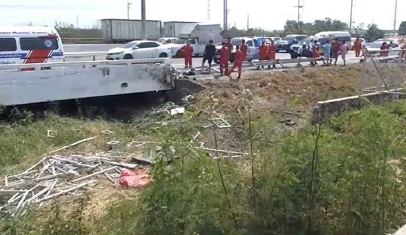 ชลบุรี 23 ก.พ.- เกิดอุบัติเหตุมอเตอร์เวย์ ชลบุรี-พานทอง รถบรรทุกชนราวสะพานตกคลอง อุปกรณ์โครงเหล็กตั้งเวทีการแสดงกระจายเกลื่อน คาดคนขับหลับใน