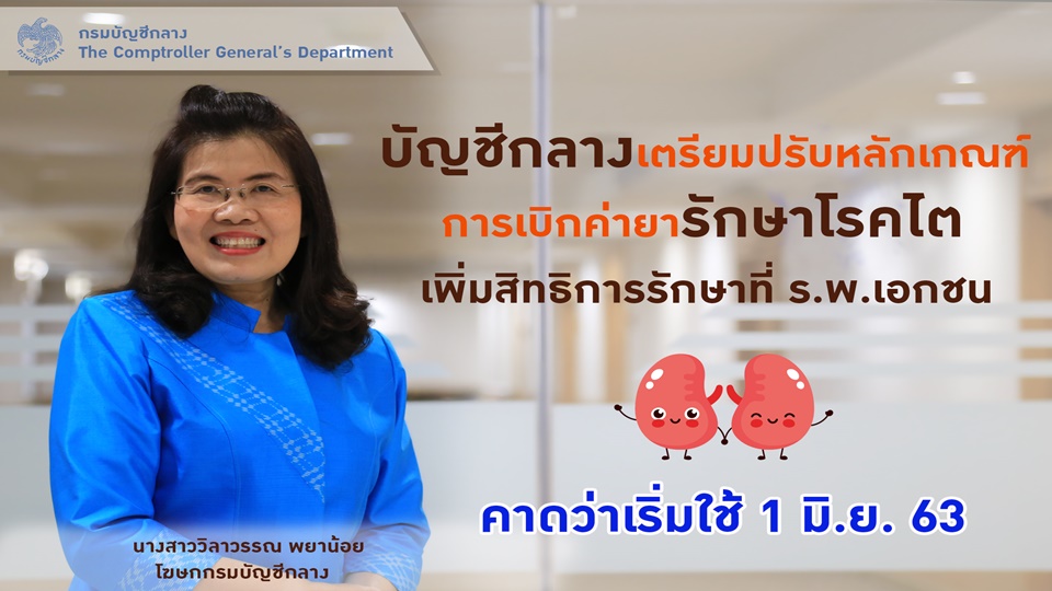ทั้งนี้ กรมบัญชีกลางเตรียมปรับปรุงหลักเกณฑ์และอัตราค่ารักษาพยาบาลสำหรับผู้ป่วยโรคไตวายเรื้อรังด้วยวิธีการฟอกเลือดด้วยเครื่องไตเทียม เพื่อให้ผู้มีสิทธิ์และบุคคลในครอบครัวที่ป่วยเป็นโรคไตวายเรื้อรังสามารถเข้ารับการรักษาที่สถานพยาบาลเอกชนได้สะดวกมากขึ้น โดยได้ปรับปรุงหลักเกณฑ์ตามรายละเอียด ดังนี้ 1. สามารถเบิกค่ายากระตุ้นเม็ดเลือดแดง (Erythropoietin) ที่สถานพยาบาลของเอกชนได้ จากเดิมผู้ป่วยต้องนำยาจากสถานพยาบาลของรัฐไปใช้ในการรักษาที่สถานพยาบาลเอกชน ทำให้คุณภาพของยาลดลง อีกทั้งยังเป็นการเพิ่มภาระการจัดเก็บยาให้กับสถานพยาบาลเอกชนด้วย และ 2. สามารถเบิกค่าตรวจทางห้องปฏิบัติการที่สถานพยาบาลเอกชนได้ จากเดิมไม่สามารถเบิกได้ เพื่อให้คุณภาพการรักษาเป็นไปอย่างมีประสิทธิภาพ