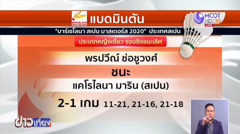 แบดมินตันเอชเอสบีซี บีดับเบิลยู เวิลด์ ทัวร์ ซูเปอร์ 300 รายการ “บาร์เซโลนา สเปน มาสเตอร์ส 2020” ที่ประเทศสเปน รอบชิงชนะเลิศ ประเภทหญิงเดี่ยว “น้องหมิว” พรปวีณ์ ช่อชูวงศ์ มือ 20 ของโลก เอาชนะ แคโรไลนา มาริน มือ 8 ของโลก มือวาง 1 ของรายการจากสเปน 2-1 เกม 11-21, 21-16, 21-18 คว้าแชมป์มาครองได้สำเร็จ
