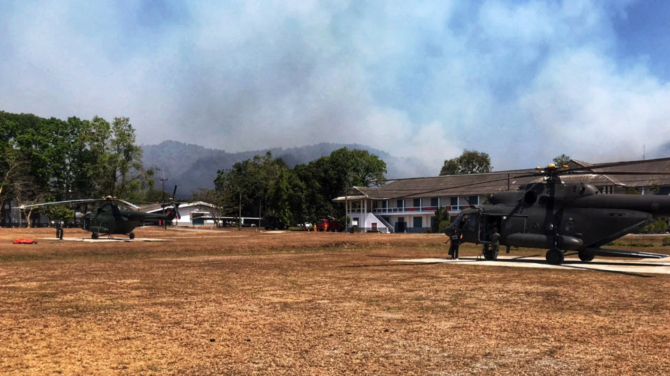 พ.อ.หญิง ศิริจันทร์ กล่าวว่า นอกจากนี้ กองทัพบกยังสนับสนุนเฮลิคอปเตอร์ MI-17 2 เครื่อง บินโปรยน้ำร่วมกับเฮลิคอปเตอร์บรรเทาสาธารณภัย KA-32 ของกรมป้องกันและบรรเทาสาธารณภัยโดยปฏิบัติการบิน ตั้งแต่ 22 กุมภาพันธ์ 2563 จนถึงปัจจุบัน ได้บินบรรทุกน้ำจากแหล่งน้ำในบริเวณโดยรอบ ไปโปรยในพื้นที่เป้าหมายแล้ว 101 เที่ยวบิน จำนวน 320,500 ลิตร เพื่อลดความร้อนในจุดที่เพลิงลุกไหม้ ทำให้กำลังภาคพื้นดินสามารถเข้าไปดับไฟ และใช้รถบรรทุกน้ำฉีดน้ำดับไฟได้อย่างปลอดภัย เฮลิคอปเตอร์ ทั้ง 3 ลำ ใช้พื้นที่ภายในโรงเรียนนายร้อยพระจุลจอมเกล้าเป็นฐานปฏิบัติการบิน รวมถึง การเติมเชื้อเพลิง การเตรียมความพร้อมและการปรนนิบัติบำรุงอากาศยาน
