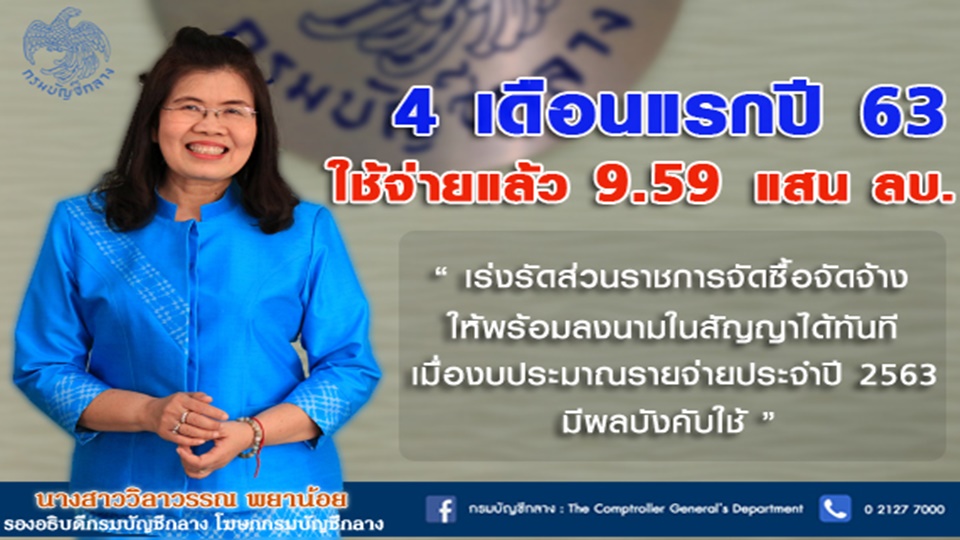 นางสาววิลาวรรณ พยาน้อย รองอธิบดีกรมบัญชีกลาง ในฐานะโฆษกกรมบัญชีกลาง เปิดเผยว่า ผลการใช้จ่ายเงินงบประมาณรายจ่ายประจำปี 2563 (1 ต.ค. 62 – 31 ม.ค.63) ซึ่งเป็นการใช้จ่ายงบประมาณปี 2562 ไปพลางก่อน โดยงบประมาณภาพรวมใช้จ่ายแล้ว 959,941 ล้านบาท ของวงเงินงบประมาณ 3 ล้าน ล้านบาท หรือคิดเป็นร้อยละ 32 จำแนกเป็น รายจ่ายลงทุนมีการใช้จ่าย 60,001 ล้านบาท ของวงเงินงบประมาณ 593,871 ล้านบาท คิดเป็นร้อยละ 10.10 รายจ่ายประจำมีการใช้จ่าย 899,940 ล้านบาท ของวงเงินงบประมาณ 2,406,129 ล้านบาท คิดเป็นร้อยละ 37.40 สำหรับเงินงบประมาณที่กันไว้เบิกเหลื่อมปี มีการใช้จ่าย 257,039 ล้านบาท ของวงเงินงบประมาณ 263,268 ล้านบาท คิดเป็นร้อยละ 97.63