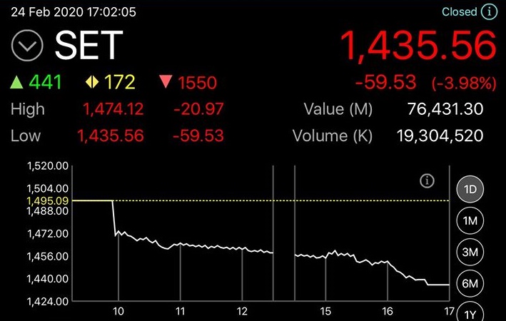 นายชัยยศ จิวางกูร ผู้ช่วยผู้อำนวยการฝ่ายวิเคราะห์หลักทรัพย์ บล.กรุงศรี กล่าวว่า ตลาดหุ้นไทยวันนี้ปรับตัวลงแรงจากความกังวลการแพร่ระบาดเชื้อไวรัสโควิด-19 ในหลายภูมิภาค ล่าสุดมีจำนวนผู้ติดเชื้อในอิตาลีและเกาหลีใต้เพิ่มขึ้น ทำให้หลายประเทศปิดกั้นพรมแดนเพื่อป้องกันการแพร่ระบาด ทำให้โอกาสเศรษฐกิจชะลอตัว ขณะที่การอภิปรายไม่ไว้วางใจรัฐบาลวันนี้ยังมีน้ำหนักไม่มากนัก