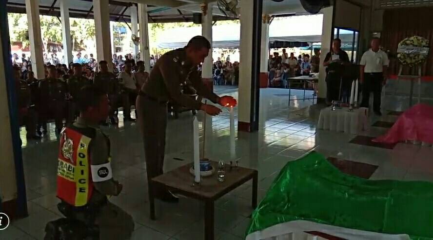 เมื่อเวลา 17.00 น. (24 ก.พ.) ที่วัดแก้วโกรวาราม อ.เมือง จ.กระบี่ พล.ต.ต.ศักดิ์ชัย ลิ้มเจริญ ผู้บังคับการตำรวจภูธรจังหวัดกระบี่ เป็นประธานในพิธีรดน้ำศพดาบตำรวจ อายุ 47 ปี กับภรรยา อายุ 34 ปี ครูโรงเรียนอนุบาล ท่ามกลางญาติมิตรและเพื่อนร่วมงานมาร่วมพิธีจำนวนมาก หลังเกิดเหตุดาบตำรวจใช้อาวุธปืนยิงภรรยาตัวเองเสียชีวิตก่อนยิงตัวเองภายในห้องพักชั้น 4 แฟลตตำรวจ เมื่อค่ำวานนี้ (23 ก.พ.) ซึ่งเจ้าหน้าที่ได้เก็บหลักฐานอาวุธปืนพกสั้น ขนาด 9 มม.ตกอยู่ และปลอกกระสุนปืน จำนวน 2 ปลอก ส่วนสาเหตุยังไม่ทราบว่าเกิดจากเรื่องใด จากการสอบเพื่อน ๆ ที่มาร่วมงานระบุว่าที่ผ่านมาดาบตำรวจใช้ชีวิตตามปกติดี มีที่ดินสวนยาง เป็นคนมัธยัสถ์ ไม่มีปัญหาการเงิน ตั้งใจทำงาน จึงเป็นที่รักใคร่ของผู้ร่วมงานและผู้บังคับบัญชา อีกทั้งลูกสาวก็เรียนดี