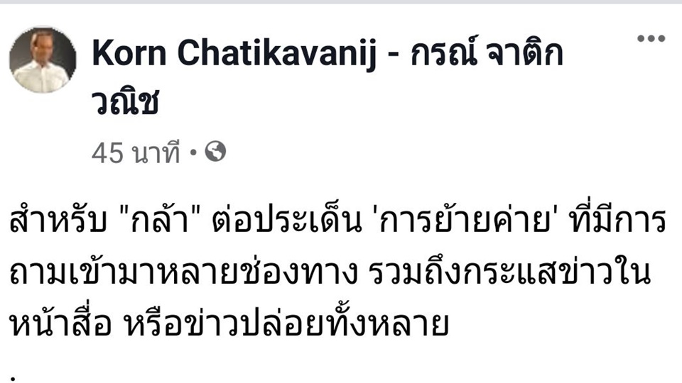 ผู้สื่อข่าวรายงานว่า นายกรณ์ จาติกวณิช ผู้ก่อตั้งพรรคกล้า โพสต์เฟชบุ๊กกรณีมีกระแสข่าวส.ส.จากพรรคอนาคตใหม่ ที่ถูกยุบพรรค จะมาสมัครเป็นสมาชิกพรรคกล้า ว่า สำหรับ “กล้า” ต่อประเด็น ‘การย้ายค่าย’ ที่มีการถามเข้ามาหลายช่องทาง รวมถึงกระแสข่าวในหน้าสื่อ หรือข่าวปล่อยทั้งหลาย