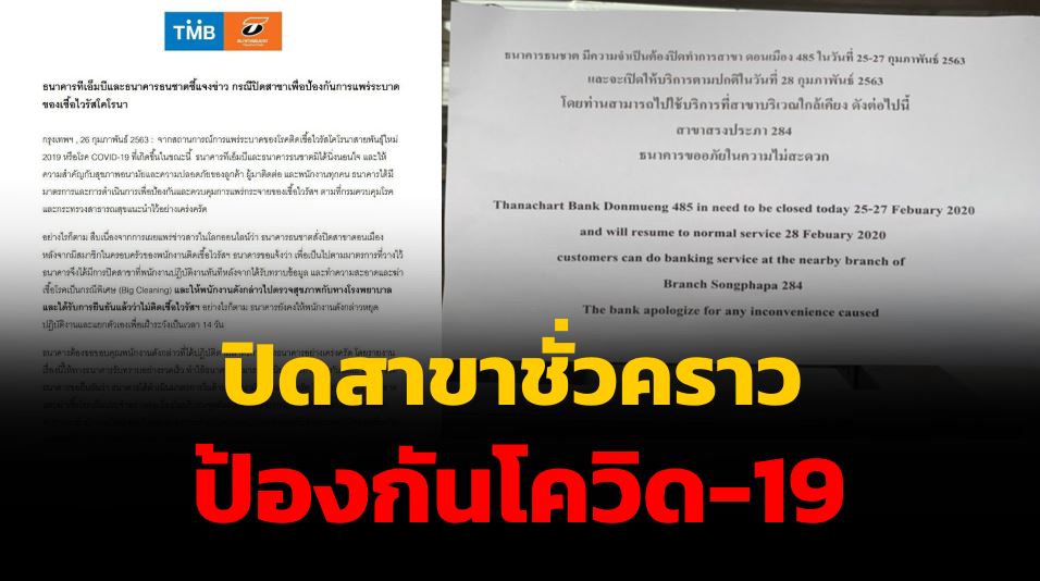 กรุงเทพฯ 26 ก.พ. – ทีเอ็มบี-ธนชาต ชี้แจงข่าวกรณีปิดสาขา เพื่อป้องกันการแพร่ระบาดของเชื้อไวรัสโควิด-19