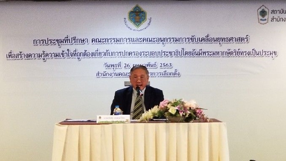 ผู้สื่อข่าวรายงานว่า เวลา 09.00 น. วันนี้ (26 ก.พ.) นายธวัชชัย เทอดเผ่าไทย นายสันทัด ศิริอนันต์ไพบูลย์ และนายเลิศวิโรจน์ โกวัฒนะ กรรมการการเลือกตั้ง (กกต.) ร่วมพิธีเปิดการประชุมคณะกรรมการการและคณะอนุกรรมการขับเคลื่อนยุทธศาสตร์ เพื่อสร้างความรู้ความเข้าใจที่ถูกต้องเกี่ยวกับการปกครองระบอบประชาธิปไตยอันมีพระมหากษัตริย์ทรงเป็นประมุข ครั้งที่ 1/2563