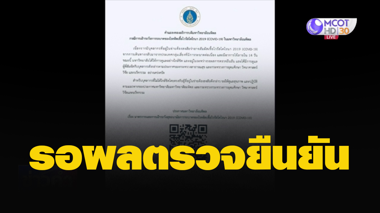 มหาวิทยาลัยมหิดล เผยแพร่คำแถลงของ ศ.นพ.บรรจง มไหสวริยะ รักษาการแทนอธิการบดีฯ ระบุการเฝ้าระวังการระบาดของโรคติดเชื้อไวรัสโคโรนา 2019 (COVID-19) เนื่องจากมีบุคลากรที่อยู่ในข่ายต้องสงสัยว่าอาจสัมผัสเชื้อ COVID-19 จากการเดินทางกลับมาจากประเทศกลุ่มเสี่ยง และมีอาการไข้ ภายใน 14 วัน ขณะนี้มหาวิทยาลัยได้ให้การดูแลอย่างใกล้ชิด อยู่ระหว่างรอการตรวจยืนยัน และดูแลผู้ที่สัมผัสกับบุคลากรดังกล่าว ตามประกาศของกระทรวงสาธารณสุข และกระทรวงการอุดมศึกษาฯ อย่างเคร่งครัด ทั้งนี้ ในแถลงการณ์ไม่ได้ระบุว่า บุคลากรต้องสงสัยคนดังกล่าวอยู่ในคณะใด หรือส่วนงานใดของมหาวิทยาลัย. – สำนักข่าวไทย