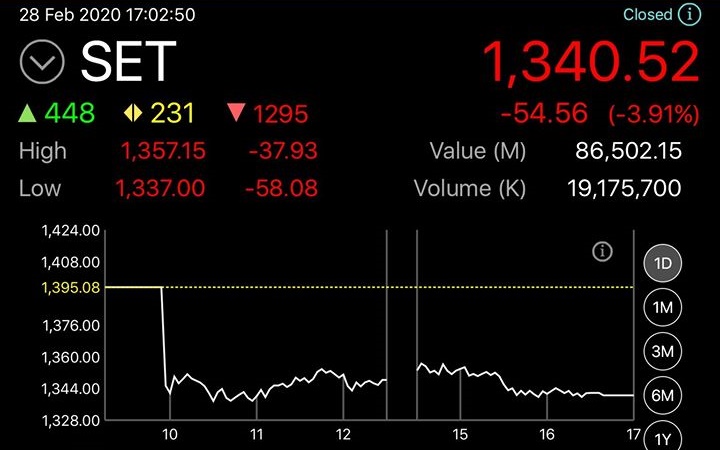 กรุงเทพฯ 28 ก.พ. – ตลาดหลักทรัพย์ปิดวันนี้ที่ระดับ 1,340.52 จุด ลดลง 54.56 จุด (-3.91%) มูลค่าการซื้อขาย 86,502.15 ล้านบาท