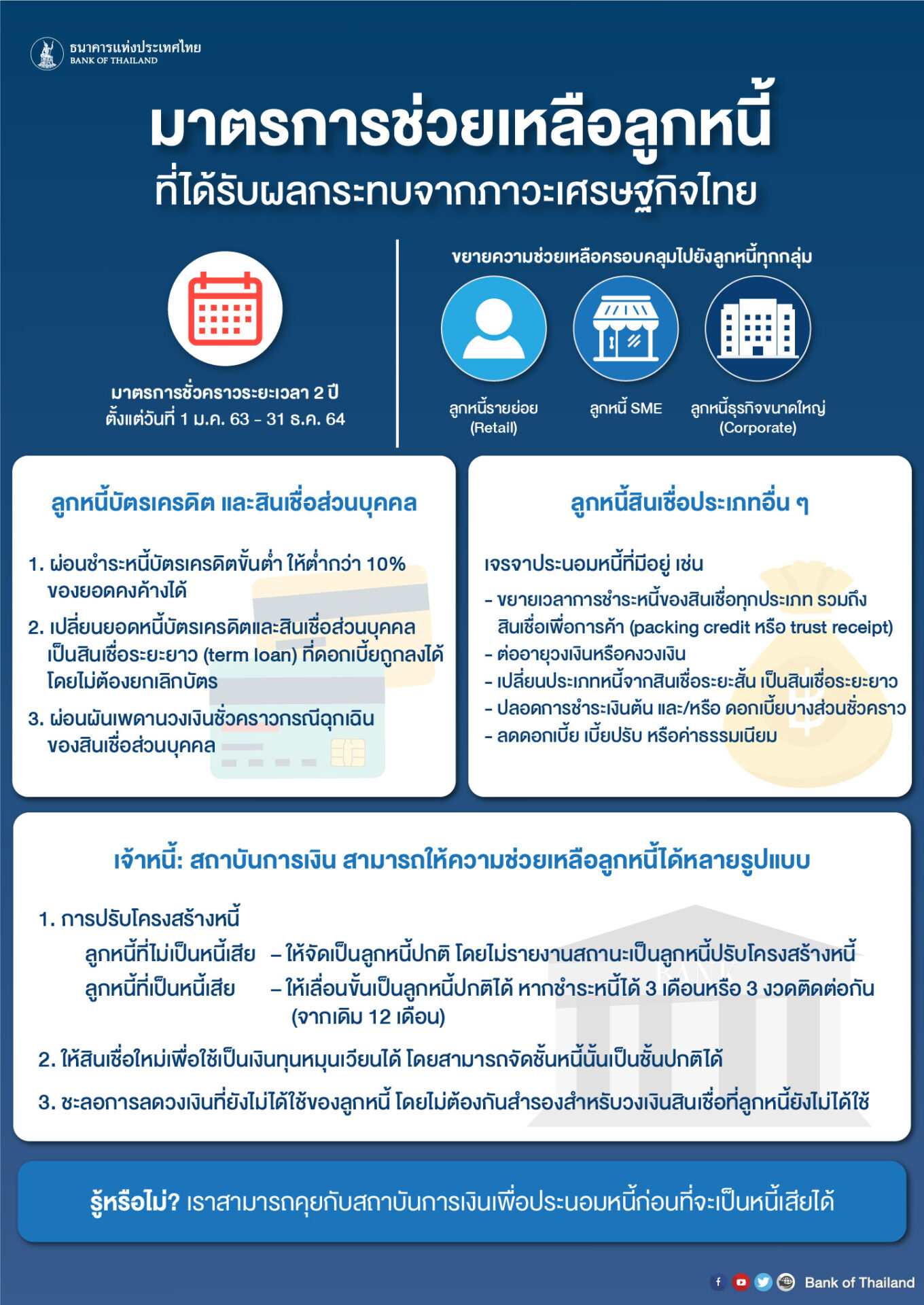 ธปท. ได้ติดตามสถานการณ์และมีความห่วงใยมาโดยตลอด จึงได้ร่วมกับสถาบันการเงิน กำหนดมาตรการช่วยเหลือเพิ่มเติมแก่ลูกหนี้ธุรกิจทุกประเภทและครัวเรือนที่ได้รับผลกระทบจากเหตุการณ์ดังกล่าวในเชิงรุก โดยเน้นการให้ความช่วยเหลือด้านสภาพคล่องและเร่งปรับโครงสร้างหนี้ อาทิ ให้เงินทุนหมุนเวียนเพิ่ม พักชำระหนี้เป็นการชั่วคราว ขยายระยะเวลาการชำระหนี้ ลดดอกเบี้ยและค่าธรรมเนียม ผ่อนชำระขั้นต่ำบัตรเครดิตได้ต่ำกว่าร้อยละ 10 เพิ่มวงเงินชั่วคราวสำหรับสินเชื่อส่วนบุคคล เพื่อช่วยให้ลูกหนี้สามารถผ่านพ้นช่วงวิกฤตินี้ไปได้ โดยกำหนดเป็นมาตรการชั่วคราวระยะเวลา 2 ปี ระหว่าง 1 มกราคม 2563 ถึง 31 ธันวาคม 2564 เพื่อให้สถาบันการเงินช่วยเหลือด้านสภาพคล่องและปรับโครงสร้างหนี้ให้แก่ลูกหนี้ได้อย่างทั่วถึงและทันท่วงที ธปท. จึงได้ปรับปรุงกฎเกณฑ์ที่เกี่ยวข้องกับการจัดชั้นและการกันเงินสำรอง รวมทั้งการรายงานข้อมูลเครดิตของลูกหนี้เพื่อให้เข้าถึงสินเชื่อได้ง่ายขึ้น