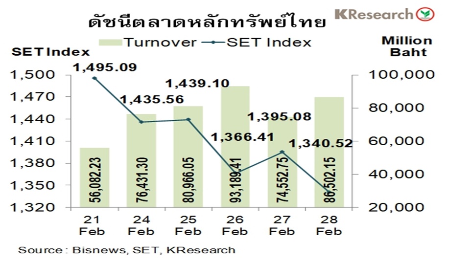 บริษัทหลักทรัพย์กสิกรไทย จำกัด รายงานว่าสัปดาห์ที่ผ่านมา (24-28 ก.พ.) ดัชนีตลาดหุ้นไทยลดลงถึง 10.34% จากสัปดาห์ก่อน ปิดที่ระดับ 1,340.52 จุด หลังร่วงแตะ 1,337 จุด ซึ่งเป็นจุดต่ำสุดในรอบเกือบ 4 ปีช่วงปลายสัปดาห์ ขณะที่มูลค่าการซื้อขายเฉลี่ยต่อวันอยู่ที่ 82,328.33 ล้านบาท เพิ่มขึ้น 36.25% จากสัปดาห์ก่อน ส่วนดัชนี mai ลดลง 12.31% จากสัปดาห์ก่อน มาปิดที่ 261.76 จุด