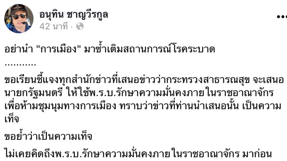 นายอนุทิน ชาญวีรกูล รองนายกรัฐมนตรี และรัฐมนตรีว่าการกระทรวงสาธารณสุข โพสต์เฟสบุ๊ค หัวข้อ “อย่านำการเมือง” มาซ้ำเติมสถานการณ์โรคระบาด โดยระบุว่า จากกรณีที่มีข่าวว่า กระทรวงสาธารณสุข จะเสนอนายกรัฐมนตรี ให้ใช้พ.ร.บ.รักษาความมั่นคงภายในราชอาณาจักร เพื่อห้ามชุมนุมทางการเมืองนั้น เป็นความเท็จ ส่วนตัวไม่เคยคิดถึงพ.ร.บ.รักษาความมั่นคงภายในราชอาณาจักรมาก่อน และไม่เคยคิดสกัดกั้น หรือห้ามการชุมนุมทางการเมือง เพื่อแสดงออกถึงสิทธิ เสรีภาพทางความคิดและการพูดของประชาชน ไม่ว่าจะเป็นประชาชนกลุ่มใด ๆ ก็ตาม หากการชุมนุมนั้นไม่ละเมิดสิทธิเสรีภาพของผู้อื่นและเป็นไปด้วยความสงบเรียบร้อย ไม่ขัดต่อกฎหมาย