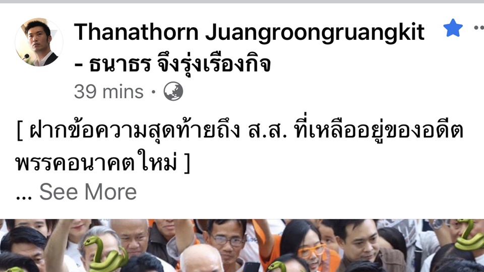 นายธนาธร จึงรุ่งเรืองกิจ อดีตหัวหน้าพรรคอนาคตใหม่ โพสต์เฟซบุ๊กส่วนตัวในหัวข้อ “ฝากข้อความสุดท้ายถึง ส.ส. ที่เหลืออยู่ของอดีตพรรคอนาคตใหม่” โดยระบุว่า ภารกิจสุดท้ายของตนในฐานะหัวหน้าพรรคอนาคตใหม่ คืองานอภิปรายไม่ไว้วางใจรัฐมนตรีรายบุคคล ภายใต้ชื่อปฏิบัติการพิน็อคคิโอได้จบลงไปแล้ว เชื่อว่า ทุกคนได้ทำให้ประชาชนเห็นถึงการทำงานอย่างสร้างสรรค์ ทุ่มเท และกล้าเผชิญหน้ากับสิ่งที่ไม่ถูกต้องอย่างกล้าหาญตรงไปตรงมาเหมือนที่สัญญาไว้ ถือเป็นเกียรติของตนที่ได้ร่วมงานกับผู้อภิปราย ทุกคนทำงานได้อย่างเป็นมืออาชีพ ถือว่าตลอด 6 เดือนที่ผ่านมาเป็นการทำงานที่สนุกและท้าทายอย่างยิ่ง