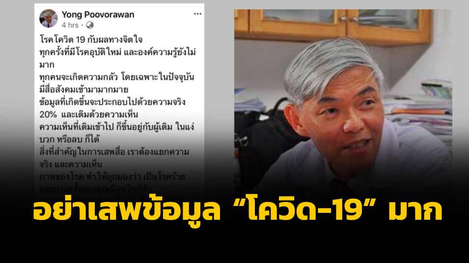 วันนี้ (2มี.ค.) ศ.นพ.ยง ภู่วรวรรณ นักวิจัยดีเด่นแห่งชาติสาขาวิทยาศาสตร์การแพทย์ ราชบัณฑิตและหัวหน้าศูนย์เชี่ยวชาญเฉพาะทางด้านไวรัสวิทยาคลินิก ภาควิชากุมารเวชศาสตร์ คณะแพทยศาสตร์ จุฬาลงกรณ์มหาวิทยาลัย โพสต์เฟซบุ๊ก Yong Poovorawan ระบุถึงสถานการณ์ไวรัสโคโรนาสายพันธุ์ใหม่ (โควิด-19) กับผลทางจิตใจ โดยมีข้อความระบุว่า