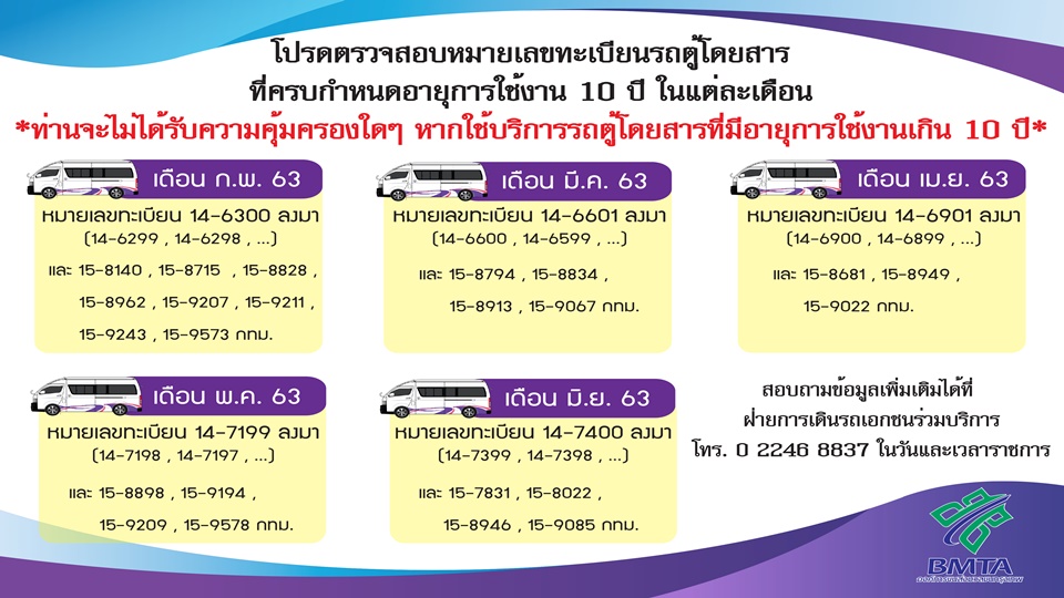 นายสุระชัย กล่าวว่า ขสมก.สำรวจหมายเลขทะเบียนรถตู้โดยสารประจำทางที่ครบกำหนดอายุการใช้งานแต่ละเดือน พร้อมทั้งทยอยแจ้งให้ประชาชนผู้ใช้บริการรถตู้โดยสารรับทราบ เพื่อจะได้ตรวจสอบหมายเลขทะเบียนก่อนตัดสินใจใช้บริการ โดยเดือนกุมภาพันธ์ 2563 ได้แก่ หมายเลข 14 – 6300 กทม.ลงมา ( 14 – 6299, 14 – 6298, …) และหมายเลข 15 – 8140, 15 – 8715, 15 – 8828, 15 – 8962, 15 – 9207, 15 – 9211, 15 – 9243, 15 – 9573 กทม. เดือนมีนาคม 2563 ได้แก่ หมายเลข 14 – 6601 กทม. ลงมา ( 14 – 6600, 14 – 6599, … ) และหมายเลข 15 – 8794, 15 – 8834, 15 – 8913, 15 – 9067 กทม. เดือนเมษายน 2563 ได้แก่ หมายเลข 14 – 6901 กทม.ลงมา (14 – 6900, 14 – 6899, …) และหมายเลข 15 – 8681, 15 – 8949, 15 – 9022 กทม. เดือนพฤษภาคม 2563 ได้แก่ หมายเลข 14 – 7199 กทม.ลงมา (14 – 7198, 14 – 7197, …) และหมายเลข 15 – 8898, 15 – 9194, 15 – 9209, 15 – 9578 กทม. และเดือนมิถุนายน 2563 ได้แก่ หมายเลข 14 – 7400 กทม.ลงมา (14 – 7399, 14 – 7398, …) และหมายเลข 15 – 7831, 15 – 8022, 15 – 8946, 15 – 9085 กทม.