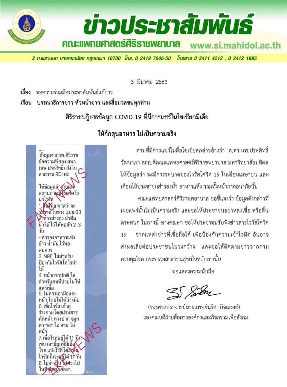 รพ.ศิริราช 3 มี.ค.-คณะแพทยศาสตร์ ศิริราชพยาบาล มหาวิทยาลัยมหิดล ชี้แจงอย่าหลงเชื่อหรือส่งต่อข้อความทางโลกโซเชียลให้สำรองน้ำดื่มอาหารแห้ง จากเหตุโควิด-19 ยันไม่เป็นความจริง