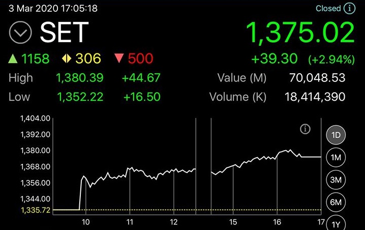 การซื้อขายหุ้นวันนี้ ดัชนีหุ้นไทยเคลื่อนไหวในแดนบวกตลอดทั้งวัน โดยทำระดับสูงสุด 1,380.39 จุด และทำระดับต่ำสุด 1,352.22 จุด