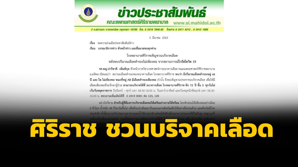 ศิริราช 4 มี.ค.-รพ.ศิริราช เชิญชวนประชาชน ร่วมบริจาคโลหิต หลังพบปริมาณเลือดสำรองไม่เพียงพอ จากสถานการณ์ “โควิด-19”