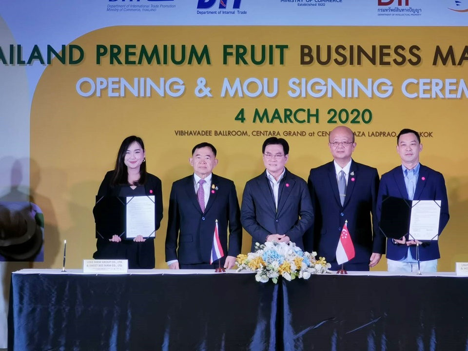 นายจุรินทร์ ลักษณวิศิษฏ์ รองนายกรัฐมนตรีและรัฐมนตรีว่าการกระทรวงพาณิชย์ กล่าวว่า ช่วงนี้ผลไม้กำลังทยอยออกสู่ตลาดทั้งมะม่วง ทุเรียน ลำไย มังคุด และเพื่อรองรับผลผลิตที่จะออกมาจำนวนมาก แต่ตลาดต่างประเทศอาจจะชะลอการสั่งซื้อจากปัญหาการระบาดของไวรัสโควิด-19 ก็ตาม เบื้องต้นมีการลงนาม MOU 2 ฉบับ ระหว่างผู้ส่งออกไทยกับผู้ซื้อจากสิงคโปร์และฮ่องกงสั่งซื้อผลไม้สด ได้แก่ ทุเรียน ส้มโอ มะม่วง ลำไย สละ และผลไม้อบแห้ง รวมถึงสินค้ากลุ่มผักสด ได้แก่ มะนาว หน่อไม้ฝรั่ง กระเจี๊ยบ ข้าวโพดอ่อน และพริก รวมปริมาณทั้งหมดกว่า 10,000 ตัน คิดเป็นมูลค่าซื้อขาย ประมาณ 1,094 ล้านบาท