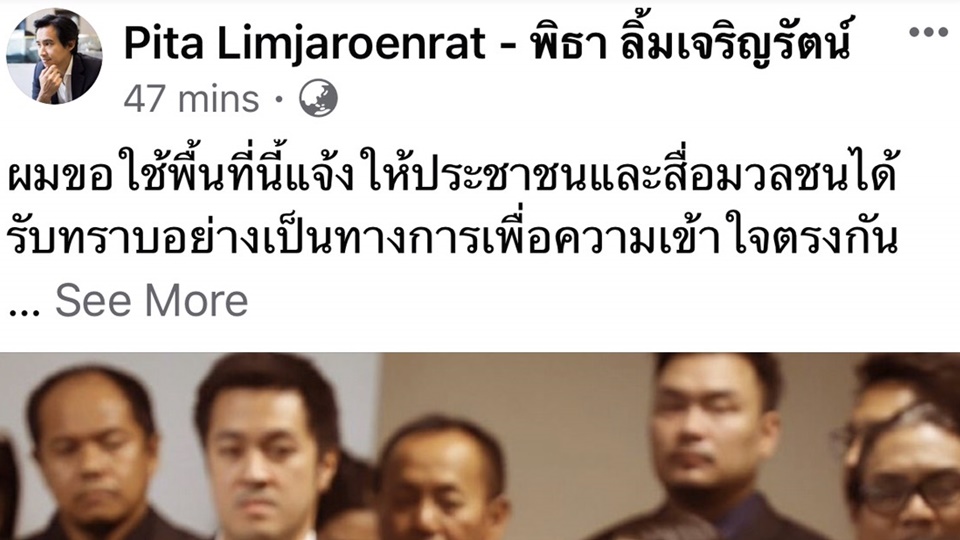 นายพิธา ลิ้มเจริญรัตน์ ส.ส.บัญชีรายชื่อ อดีตพรรคอนาคตใหม่ โพสต์ข้อความลงเฟซบุ๊กส่วนตัว ว่า ผมขอใช้พื้นที่นี้แจ้งให้ประชาชนและสื่อมวลชนได้รับทราบอย่างเป็นทางการเพื่อความเข้าใจตรงกันตามนี้ วันอาทิตย์ที่ 8 มีนาคม 2563 ส.ส. อดีตพรรคอนาคตใหม่ 55 คน จะประชุมกันเพื่อกำหนดทิศทางและแผนการดำเนินงานในอนาคต และประกาศชื่อพรรคใหม่ที่เราจะเดินไปร่วมกัน