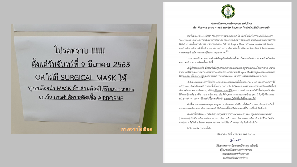 ตามที่มีสื่อ online ลงข่าวว่า“วิกฤติ” รพ.วชิรฯติดประกาศ ห้องผ่าตัดไม่มีหน้ากากอนามัยให้บุคลากรวอนนำมาเอง และอ้างถึงป้ายบริเวณหน้าห้องผ่าตัด คณะแพทยศาสตร์วชิรพยาบาล มหาวิทยาลัยนวมินทราธิราช ได้ติดป้ายไว้ว่า ตั้งแต่วันจันทร์ที่ 9 มีนาคม 2563 OR ไม่มี Surgical Mask (หน้ากากทางการแพทย์) ให้ทุกคนต้องนำหน้ากากผ้าส่วนตัวที่ได้รับแจกมาเอง ยกเว้นการผ่าตัดรายติดเชื้อ airbone ซึ่งสะท้อนให้เห็นสถานการณ์ขาดแคลนอุปกรณ์ทางการแพทย์ในสถานพยาบาลเวลานี้”