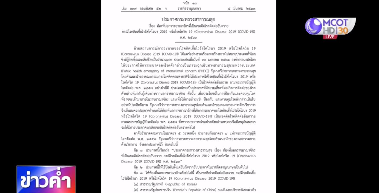 ราชกิจจานุเบกษา เผยแพร่ประกาศกระทรวงสาธารณสุข ลงนามโดยนายอนุทิน ชาญวีรกูล รองนายกรัฐมนตรี และรัฐมนตรีว่าการกระทรวงสาธารณสุข เรื่อง “ท้องที่นอกราชอาณาจักรที่เป็นเขตติดโรคติดต่ออันตราย กรณีโรคติดเชื้อไวรัสโคโรนา 2019 หรือ โรคโควิด 19 พ.ศ.2563”