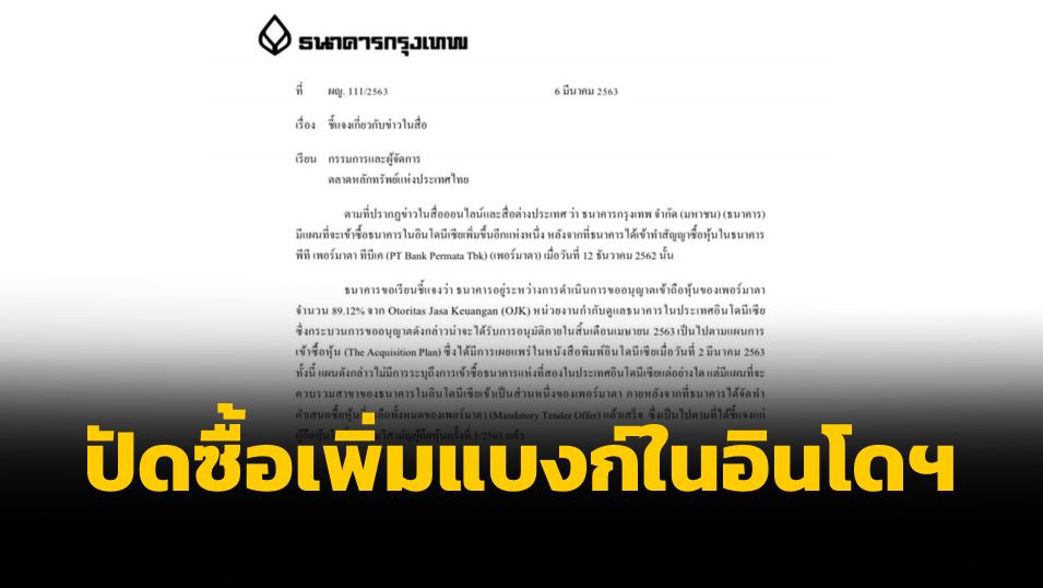 ธนาคารขอเรียนชี้แจงว่าธนาคารอยู่ระหว่างการดำเนินการขออนุญาตเข้าถือหุ้นของเพอร์มาตา จำนวน 89.12% จาก Otoritas Jasa Keuangan (OJK) หน่วยงานกำกับดูแลธนาคารในประเทศอินโดนีเซีย ซึ่งกระบวนการขออนุญาตดังกล่าวน่าจะได้รับการอนุมัติภายในสิ้นเดือนเมษายน 2563 เป็นไปตามแผนการ เข้าซื้อหุ้น (The Acquisition Plan) ซึ่งได้มีการเผยแพร่ในหนังสือพิมพ์อินโดนีเซียเมื่อวันที่ 2 มีนาคม 2563 ทั้งนี้ แผนดังกล่าวไม่มีการระบุถึงการเข้าซื้อธนาคารแห่งที่ 2 ในประเทศอินโดนีเซียแต่อย่างใด แต่มีแผนที่จะควบรวมสาขาของธนาคารในอินโดนีเซียเข้าเป็นส่วนหนึ่งของเพอร์มาตา ภายหลังจากที่ธนาคารได้จัดทำคำเสนอซื้อหุ้นที่เหลือทั้งหมดของเพอร์มาตา (Mandatory Tender Offer) แล้วเสร็จ ซึ่งเป็นไปตามที่ได้ชี้แจงแก่ผู้ถือหุ้นในที่ประชุมวิสามัญผู้ถือหุ้นครั้งที่ 1/2563 แล้ว .-สำนักข่าวไทย