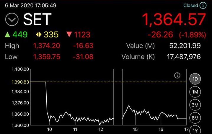 กรุงเทพฯ 6 มี.ค. – ตลาดหลักทรัพย์ปิดวันนี้ที่ระดับ 1,364.57 จุด ลดลง 26.26 จุด (-1.89%) มูลค่าการซื้อขาย 52,201.99 ล้านบาท