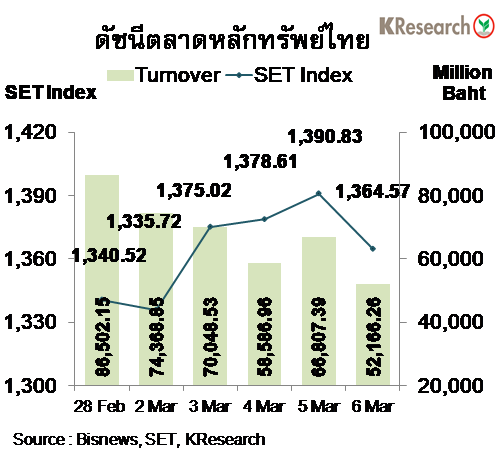 โดยหุ้นไทยย่อตัวลงช่วงสั้นๆ ต้นสัปดาห์ ก่อนจะดีดตัวขึ้นในเวลาต่อมา ขานรับการทยอยปรับลดดอกเบี้ยของธนาคารกลางประเทศต่างๆ โดยเฉพาะธนาคารกลางสหรัฐฯ รวมถึงการเตรียมพิจารณามาตรการกระตุ้นเศรษฐกิจในประเทศเพื่อลดผลกระทบของไวรัสโควิด-19 อย่างไรก็ดี ดัชนีฯ ลดช่วงบวกลงในช่วงปลายสัปดาห์ หลังการระบาดของไวรัสโควิด-19 นอกจีนมีสัญญาณรุนแรงมากขึ้น ซึ่งกระตุ้นความกังวลต่อการชะลอตัวของทั้งเศรษฐกิจโลกและไทย