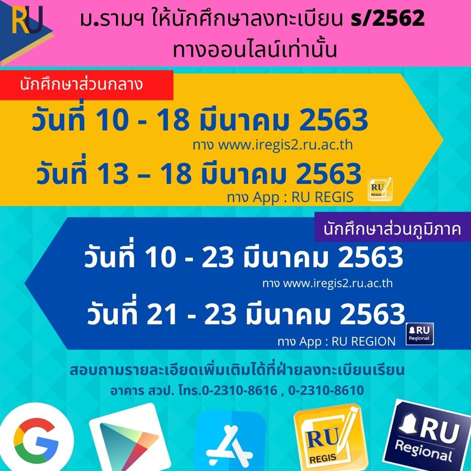 ส่วนการลงทะเบียนเรียน ภาคฤดูร้อน/2562 ของนักศึกษาส่วนภูมิภาค เปลี่ยนเป็นลงทะเบียนออนไลน์เช่นกัน โดยลงทะเบียนเรียนทางอินเทอร์เน็ตได้ที่ www.iregis2.ru.ac.th ระหว่างวันที่10-23 มีนาคม 2563 หรือลงทะเบียนเรียนผ่านแอปพลิเคชัน “RU REGION” ระหว่างวันที่ 21-23 มีนาคม 2563