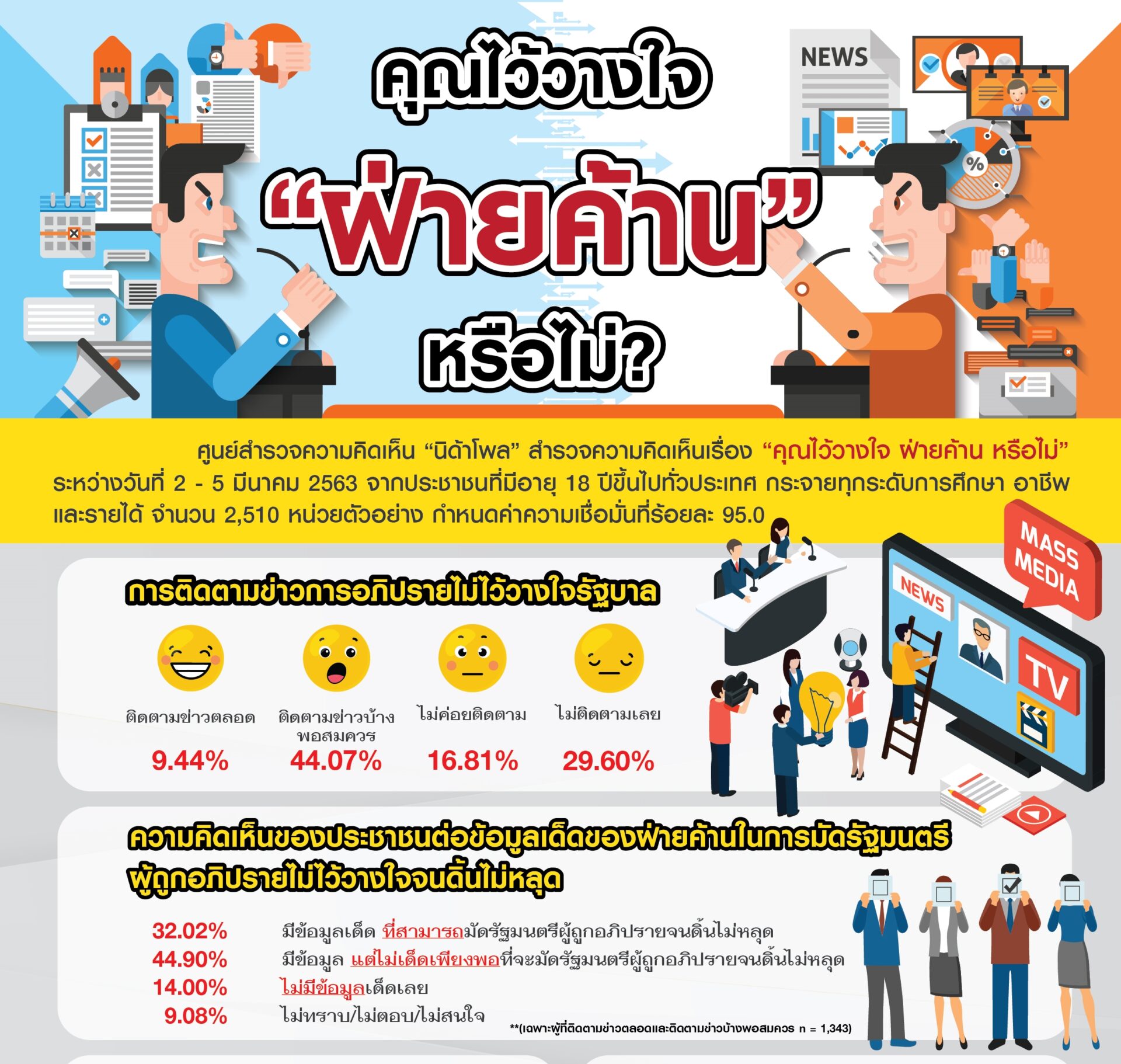 ผู้สื่อข่าวรายงานว่า ศูนย์สำรวจความคิดเห็น “นิด้าโพล” สถาบันบัณฑิตพัฒนบริหารศาสตร์ (นิด้า) เปิดเผยผลสำรวจของประชาชน เรื่อง “คุณไว้วางใจ ฝ่ายค้านหรือไม่?” โดยทำการสำรวจประชาชนจำนวน 2,510 หน่วยตัวอย่าง เกี่ยวกับการติดตามข่าวการอภิปรายไม่ไว้วางใจรัฐบาล และการไว้วางใจการทำงานของฝ่ายค้านในการตรวจสอบการทำงานของรัฐบาล พบว่าร้อยละ 9.44ติดตามข่าวการอภิปรายไม่ไว้วางใจรัฐบาลตลอด ส่วนร้อยละ 44.07 ระบุว่าติดตามข่าวบ้างพอสมควร ร้อยละ 16.81 ระบุว่า ไม่ค่อยติดตาม ร้อยละ 29.60 ระบุว่า ไม่ติดตามเลย และร้อยละ 0.08 ระบุว่า ไม่ทราบ/ไม่ตอบ/ ไม่สนใจ