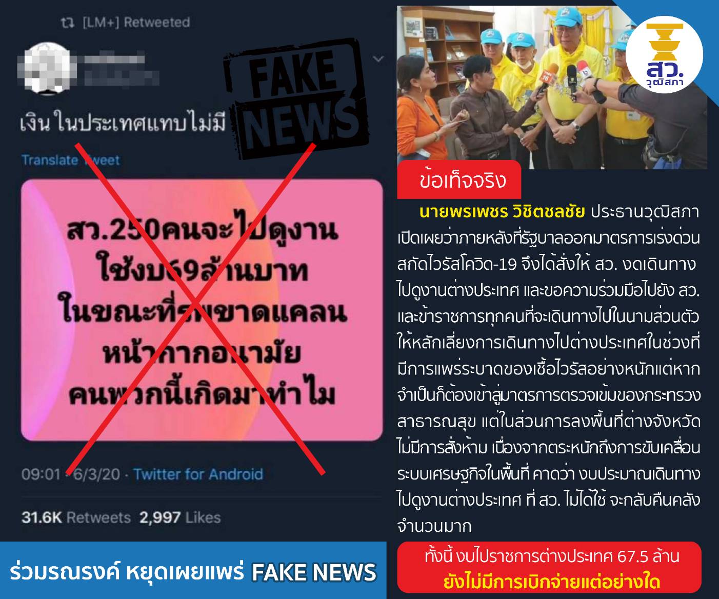 กทม. 8 มี.ค. -นายคำนูณ สิทธิสมาน ส.ว. โพสต์ข้อความผ่านเฟสบุ๊ก Kamnoon Sidhisamarn ชี้แจงกรณีมีการเผยแพร่ข่าวในโลกออนไลน์ว่ามีสมาชิกวุฒิสภาใช้งบประมาณเดินทางไปดูงานในต่างประเทศ โดยยืนยันว่า ไม่จริง โดยขณะนี้ วุฒิสภาไม่มีการใช้งบประมาณเพื่อการเดินทางไปดูงานต่างประเทศแม้แต่บาทเดียวและล่าสุดนายพรเพชร วิชัตชลชัย ประธานวุฒิสภามีคำสั่งห้ามสมาชิกวุฒิสภาและข้าราชการสำนักงานเลขาธิการวุฒิสภาทุกคนเดินทางไปราชการต่างประเทศในช่วงเวลานี้ เช่นเดียวกับประธานสภาผู้แทนราษฎรที่ออกคำสั่งมาในเวลาไล่เรี่ยกัน ขณะที่สมาชิกวุฒิสภาจำนวนหนึ่งและกรรมาธิการหลายคณะเสนอและแสดงเจตจำนงมาก่อนหน้านี้โดยมีมติอย่างเป็นทางการแล้วว่าจะไม่เดินทางไปดูงานต่างประเทศอย่างแน่นอนตลอดปีงบประมาณ 2563 นี้และขอให้คืนงบประมาณส่วนนี้กลับสู่แผ่นดินเพื่อไปใช้ในการอื่นที่จำเป็นต่อไป.-สำนักข่าวไทย
