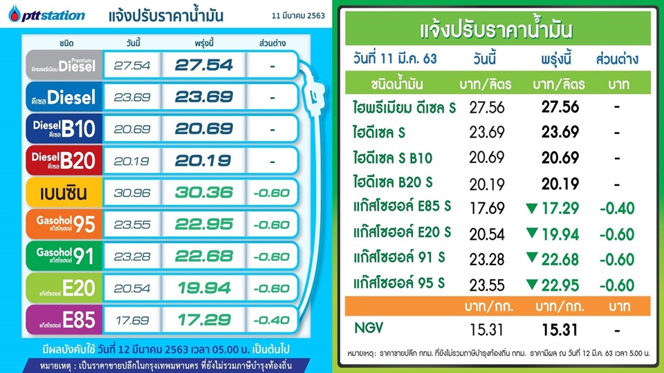 หลังรับทราบมติ กบน. ทาง PTT Station และบางจากฯ ประกาศปรับลดราคาขายปลีกน้ำมันกลุ่มเบนซินและแก๊สโซฮอลล์ทุกชนิดลง 60 สตางค์ต่อลิตร เว้น E85 ลดลง 40 สตางค์ต่อลิตร ส่วนกลุ่มดีเซลทุกชนิดคงเดิม มีผล 12 มีนาคม 2563 เวลา 05.00 น. เป็นต้นไป โดยราคาขายปลีกจะเป็นดังนี้ เบนซิน 30.36 บาท/ลิตร แก๊สโซฮอล์ 95 ราคา 22.95 บาท E20 ราคา 19.94 บาท แก๊สโซฮอล์ 91 ราคา 22.68 บาท E85 ราคา 17.29 บาท โดยราคาขายปลีกข้างต้นยังไม่รวมภาษีบำรุงกรุงเทพมหานคร ทั้งนี้ นับว่าเป็นการปรับลดราคาต่อเนื่องเป็นวันที่ 3 หลังเกิดสงครามราคาน้ำมัน และหากรวมตั้งแต่วันที่ 27 กุมภาพันธ์-12 มีนาคม 2563 กลุ่มเบนซินลดลงรวม 3 บาท/ลิตร และบี 10 ลดลง 2.90 บาท/ลิตร. -สำนักข่าวไทย