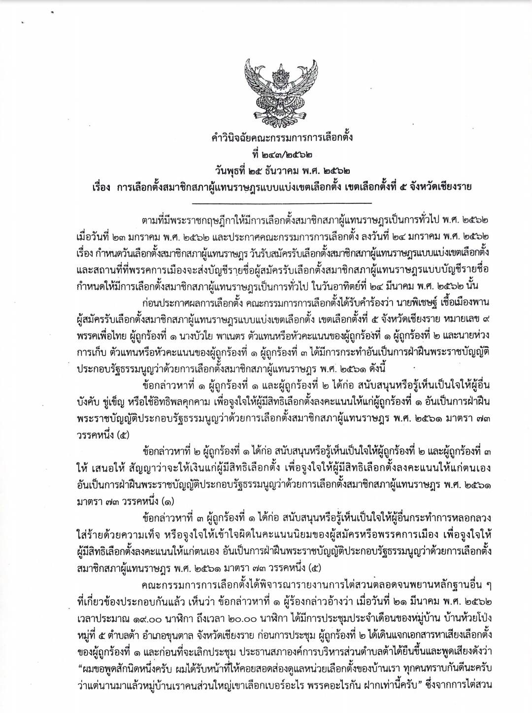 วันนี้ ( 11 มี.ค.) เว็บไซต์สำนักงาน กกต.ได้เผยแพร่คำวินิจฉัย กกต. ยกคำร้องในกรณีที่นายพิเชษฐ์ เชื้อเมืองพาน ส.ส.เขต 5 เชียงราย พรรคเพื่อไทย ถูกกล่าวหาในการเลือกตั้ง ส.ส.เมื่อวันที้ 24 มีนาคม 2562 ว่าให้หัวคะแนนแจกเงินเพื่อจูงใจผู้มีสิทธิเลือกตั้งให้เลือกตัวเอง และกรณีถูกกล่าวหาว่าพรรคเพื่อไทยจัดเวทีปราศรัยหาเสียงเมื่อ 10 มีนาคม 2562 ที่โรงเรียนชุมชนบ้านศรีดอนชัย อ.เชียงของ และนายอดิศร เพียงเกษ แกนนำพรรคเพื่อไทยได้มีการปราศรัยหาเสียงใส่ร้ายพรรคพลังประชารัฐ และพล.อ.ประยุทธ์ จันทร์โอชา ผู้ได้รับการเสนอชื่อเป็นนายกรัฐมนตรีของพรรคพลังประชารัฐในขณะนั้น ว่า “วันนี้ดีใจที่ได้มีโอกาสมาพูดจากับพี่น้อง คน ๆ นั้น ผมไม่อยากเอ่ยชื่อ มันเสนียดปากผม ประยุทธ์ จันทร์โอชาครับ คุณปล้นอำนาจประชาชน พี่น้องตายไป 99 ศพ ส.ว.ก็จะตั้งเอง ประยุทธ์ตั้งประวิตร แต่งตั้ง ส.ว.มันจะมีพวกมันทั้งนั้น” โดย กกต.เห็นว่าจากการไต่สวนพยานที่ไปฟังการปราศรัยต่างให้ถ้อยคำว่าการปราศรัยดังกล่าวเป็นการกล่าวพาดพิงการทำงานของรัฐบาลที่ผ่านมาที่มีพล.อ.ประยุทธ์ เป็นนายกฯ โดยไม่ได้พาดพิงตัวผู้ร้อง ประกอบกับเมื่อพิจารณาถ้อยคำที่ใช้ในการปราศรัยมีลักษณะเป็นการวิพากษ์วิจารณ์เชิงการเมือง ด้วยการใช้คำพูดเชิงเปรียบเปรย ประชดประชันเท่านั้น ยังไม่ถึงขั้นเป็นการหลอกลวง ใส่ร้ายด้วยความเท็จหรือจูงใจให้เข้าใจผิดในคะแนนนิยม จึงยังฟังไมได้มีการกระทำฝ่าฝืนกฎหมาย