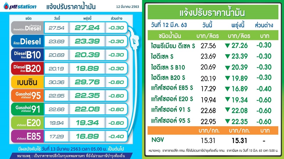 PTT Station และบางจากฯ ปรับลดราคาขายปลีกน้ำมันกลุ่มเบนซินและแก๊สโซฮอลล์ทุกชนิดลดลง 60 สตางค์ต่อลิตร ยกเว้น E85 ลดลง 40 สตางค์ต่อลิตร ส่วนกลุ่มดีเซลทุกชนิดลดลง 30 สตางค์ต่อลิตร มีผล 13 มีนาคม 2563 เวลา 05.00 น. เป็นต้นไป โดยราคาขายปลีกจะเป็นดังนี้ เบนซิน 29.76 บาท แก๊สโซฮอล์ 95 ราคา 22.35 บาท E20 ราคา 19.34 บาท แก๊สโซฮอล์ 91 ราคา 22.08 บาท E85 ราคา 16.89 บาท ดีเซล 23.39 บาท B10 ราคา 20.39 บาท B20 ราคา 19.89 บาท และดีเซลพรีเมี่ยม 27.24 บาทต่อลิตร โดยราคาขายปลีกข้างต้นยังไม่รวมภาษีบำรุงกรุงเทพมหานคร.-สำนักข่าวไทย