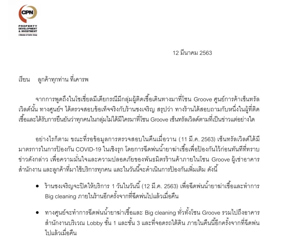 ทางศูนย์จะทำการฉีดพ่นน้ำยาฆ่าเชื้อและ Big cleaning ทั่วทั้งโซน Groove รวมถึงอาคารสำนักงานบริเวณ Lobby ชั้น 1 และชั้น 3 และที่จอดรถใต้ดิน ภายในคืนนี้อีกครั้งจากที่ฉีดพ่นไปแล้วเมื่อคืน และทุกร้านในโซน Groove ที่ได้ทำความสะอาดครั้งใหญ่เรียบร้อยแล้วเมื่อคืนนี้จะสามารถเปิดให้บริการตามปกติวันนี้ (ยกเว้นร้านชงเจริญที่จะเปิดให้บริการวันพรุ่งนี้)