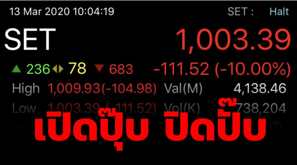 กรุงเทพฯ 13 มี.ค. –ตลาดหลักทรัพย์แห่งประเทศไทย ( ตลท.) หยุดทำการซื้อขายหลักทรัพย์เป็นการชั่วคราว 30 นาที ตั้งแต่เวลา 09.59-10.29 น. หลังจากดัชนีราคาหลักทรัพย์ปรับตัวลดลง 111.52 จุด คิดเป็น 10.00% จากดัชนีราคาปิดวันทำการก่อนหน้า (Circuit Breaker Level 1)