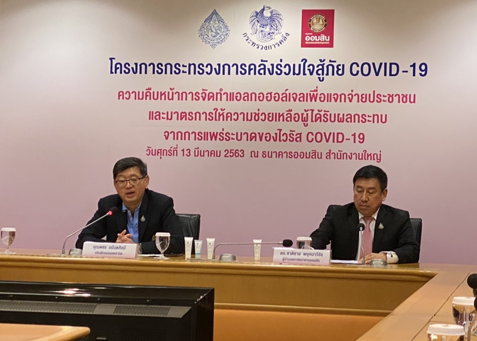นายชาติชาย พยุหนาวีชัย ผู้อำนวยการธนาคารออมสิน เปิดเผยว่า จากความร่วมมือดังกล่าวองค์การสุรา กรมสรรพสามิตกำลังเร่งผลิตแอลกอฮอล์เจลเพื่อทำความสะอาดมือให้เสร็จ 1 ล้านชิ้น วันที่ 24 มีนาคมนี้ จากนั้นจะจัดส่งให้สาขาของธนาคารออมสินที่มีอยู่ 1,060 สาขาทั่วประเทศ โดยกำหนดแจกประชาชนวันที่ 27 มีนาคม และ 10 เมษายน 2563 เวลา 09.00 น. พร้อมกันที่ธนาคารออมสินทุกสาขาทั่วประเทศ ล็อตละ 500,000 ชิ้น โดยจะแจกให้แก่ประชาชนคนละ 1 ชิ้น