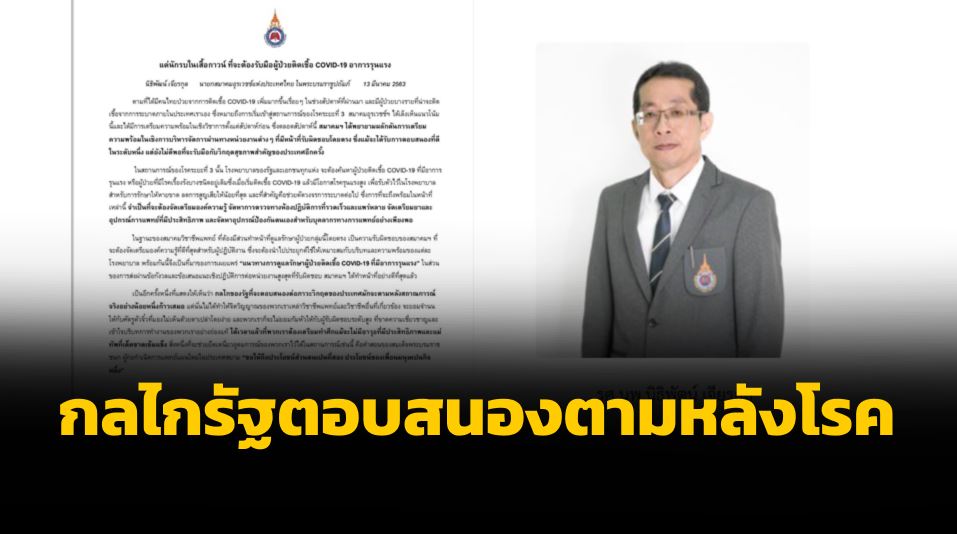 กทม.13 มี.ค.-สมาคมอุรเวชช์แห่งประเทศไทยฯ (แพทย์โรคทรวงอก) ออกแถลงการณ์ ให้กำลังใจทีมแพทย์เตรียมพร้อมรับมือผู้ป่วยติดเชื้อโควิด-19 อาการรุนแรง ห่วงกลไกรัฐตอบสนองต่อภาวะวิกฤตของประเทศ ตามหลังสถานการณ์จริง