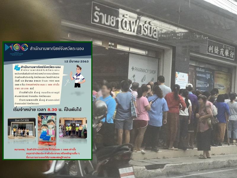 ระนอง 13 มี.ค.- พรึบเดียวหมดใน 1 ชั่วโมง หน้ากากอนามัยธงฟ้าที่จังหวัดระนอง ประชาชนมาเข้าแถวรอแต่เช้าตรู่หน้าร้านธงฟ้าประชารัฐทั้ง 2 แห่ง