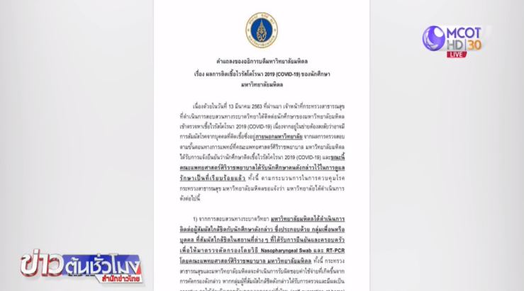 มหาวิทยาลัยมหิดล ออกแถลงการณ์ระบุว่าพบนักศึกษามหาวิทยาลัยติดเชื้อโควิด-19 หลังเมื่อวานนี้ เจ้าหน้าที่สาธารณสุข ได้ติดต่อนักศึกษามหาวิทยาลัยมหิดล เข้าตรวจหาเชื้อไวรัสโคโรนา 2019 เนื่องจากอยู่ในข่ายต้องสงสัยว่ามีการสัมผัสโรคจากบุคคลที่ติดเชื้อ ซึ่งอยู่ภายนอกมหาวิทยาลัย ผลการตรวจสอบได้รับการแจ้งยืนยันว่า นักศึกษาติดเชื้อไวรัสโคโรนา 2019และขณะนี้คณะแพทยศาสตร์ศิริราชพยาบาลได้รับนักศึกษาคนดังกล่าวไว้ดูแลรักษาแล้ว ซึ่งมหาวิทยาลัยได้ปิดส่วนงาน ห้องเรียน รวมถึงสถานที่ที่นักศึกษาเข้าไปใช้ เพื่อทำความสะอาดและฆ่าเชื้อตามมาตรฐานในวันนี้และพรุ่งนี้ และให้ผู้ใกล้ชิดนักศึกษาดังกล่าวมาตรวจคัดกรองและเฝ้าระวังอาการดังกล่าว.-สำนักข่าวไทย