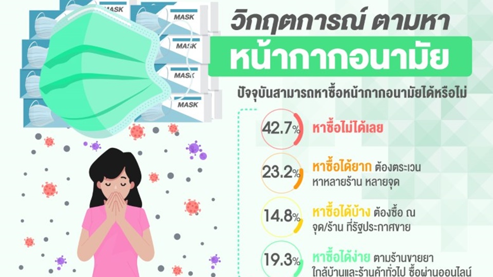 กรุงเทพโพลล์ โดยศูนย์วิจัยมหาวิทยาลัยกรุงเทพ สำรวจความคิดเห็นประชาชน เรื่อง “วิกฤตการณ์ตามหาหน้ากากอนามัย” โดยเก็บข้อมูลกับประชาชนจากทุกภูมิภาคทั่วประเทศ จำนวน 1,199 คน พบว่า ประชาชน ร้อยละ 42.7 ระบุว่าปัจจุบันหาซื้อหน้ากากอนามัยไม่ได้เลย รองลงมาร้อยละ 23.2 ระบุว่า หาซื้อได้ยากถึงยากที่สุด ต้องตระเวนหาหลายร้าน หลายจุด และร้อยละ 14.8 ระบุว่าพอหาซื้อได้บ้าง ต้องซื้อ ณ จุด/ร้าน ที่รัฐประกาศขาย