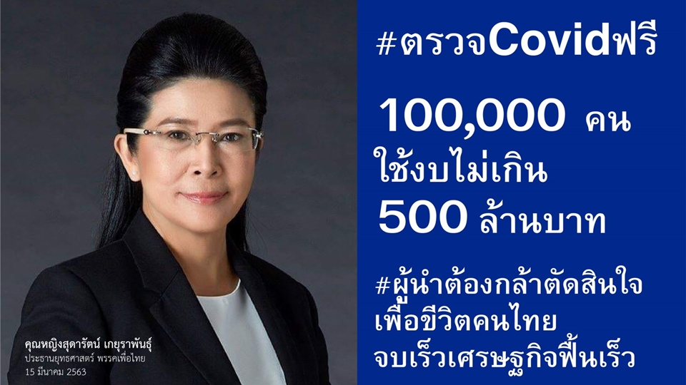 กรุงเทพฯ 15 มี.ค.-“คุณหญิงสุดารัตน์” จี้นายกฯตัดสินใจตรวจกลุ่มเสี่ยงโควิด-19ฟรี ชี้ตัดสินใจเร็วเศรษฐกิจก็จะฟื้นเร็ว