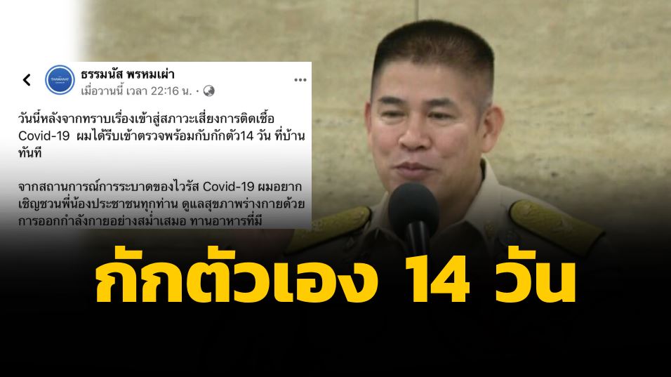 กรุงเทพฯ 16 มี.ค.- “ร.อ.ธรรมนัส” โพสต์เพชบุ๊ก กักตัวเองที่บ้านพัก 14 วัน หลังพบมีความเสี่ยงติดเชื้อไวรัสโควิด-19 เหตุจากไปปฏิบัติธรรมที่พระธาตุพนม จ.นครพนม ในช่วงเวลาเดียวกับเซียนมวยที่ติดเชื้อโควิด-19 ไปปฏิบัติธรรม