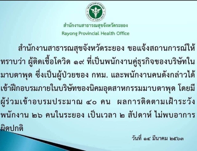 ระยอง 16 มี.ค.- สสจ.ระยอง แจ้งการเฝ้าระวัง 26 พนักงานมาร่วมอบรมที่มาบตาพุด คอร์สเดียวกับที่พบผู้ติดเชื้อโควิด-19 ครบแล้ว 14 วัน ไม่พบอาการผิดปกติ