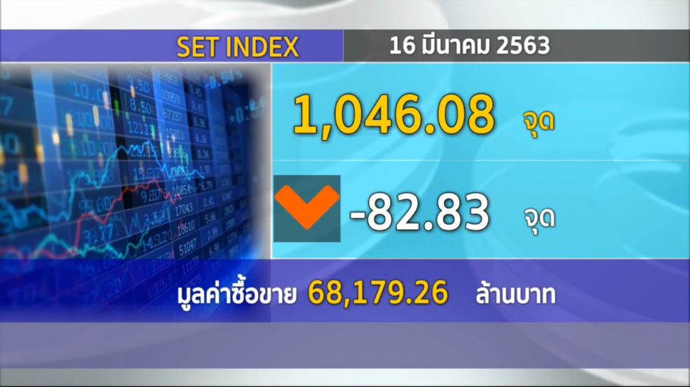 กรุงเทพฯ 16 มี.ค.-ดัชนีตลาดหุ้นไทยวันนี้ (16 มี.ค.) ปิดการซื้อขายที่ 1,046.08 จุด ลดลง 82.83 จุด หรือ 7.34% มูลค่าการซื้อขาย 68,179.26 ล้านบาท ตลาดยังกังวลต่อตัวเลขผู้ติดโควิด-19 ในไทยที่เพิ่มมากขึ้นต่อเนื่อง.-สำนักข่าวไทย