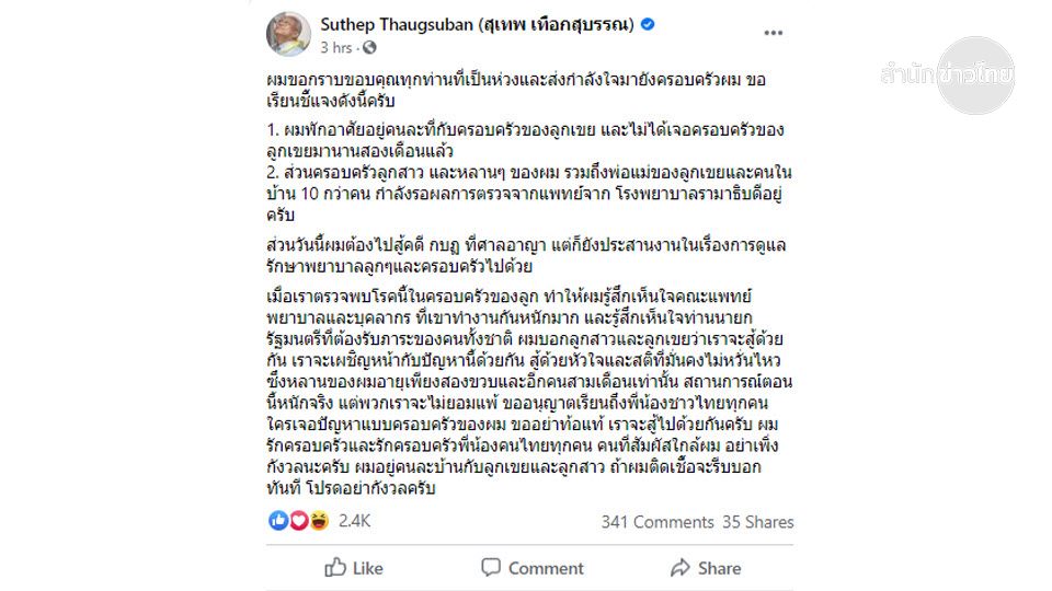 “ขออนุญาตเรียนถึงพี่น้องชาวไทยทุกคน ใครเจอปัญหาแบบครอบครัวของผม ขออย่าท้อแท้ เราจะสู้ไปด้วยกันครับ ผมรักครอบครัวและรักครอบครัวพี่น้องคนไทยทุกคน คนที่สัมผัสใกล้ผม อย่าเพิ่งกังวลนะครับ ผมอยู่คนละบ้านกับลูกเขยและลูกสาว ถ้าผมติดเชื้อจะรีบบอกทันที โปรดอย่ากังวลครับ”นายสุเทพ ระบุ .- สำนักข่าวไทย