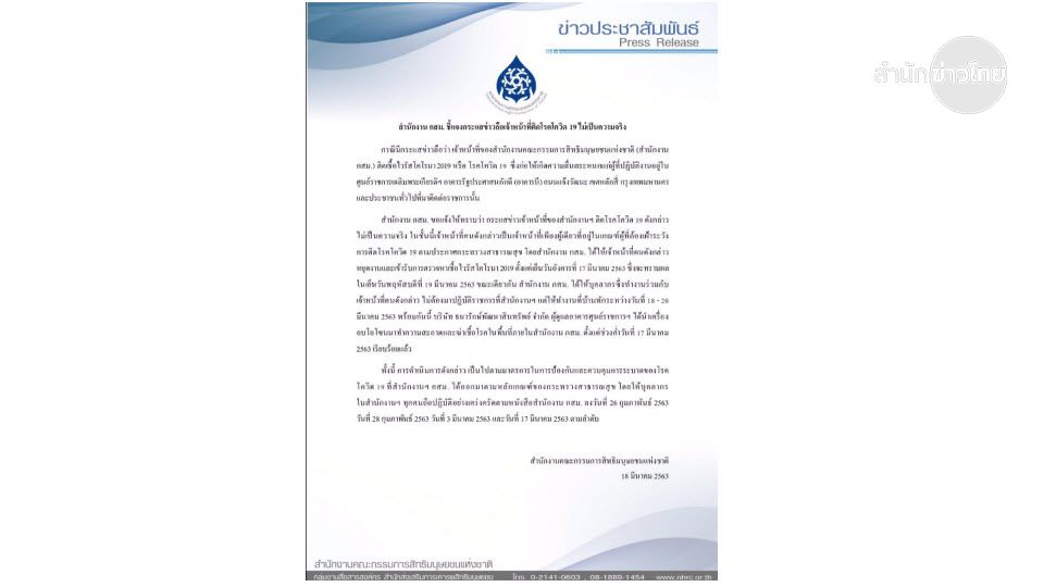 โดยเอกสารชี้แจงว่า ข่าวดังกล่าวไม่เป็นความจริง สำนักงาน กสม.มีเจ้าหน้าที่เพียงคนเดียวที่อยู่ในเกณฑ์เฝ้าระวังตามประกาศกระทรวงสาธารณสุข ซึ่งได้ให้เจ้าหน้าที่คนดังกล่าวหยุดงาน และเข้ารับการตรวจหาเชื้อโควิด-19 ตั้งแต่เย็นวันอังคารที่ 17 มีนาคม 2563 ซึ่งจะทราบผลเย็นวันพรุ่งนี้ (19 มี.ค.)