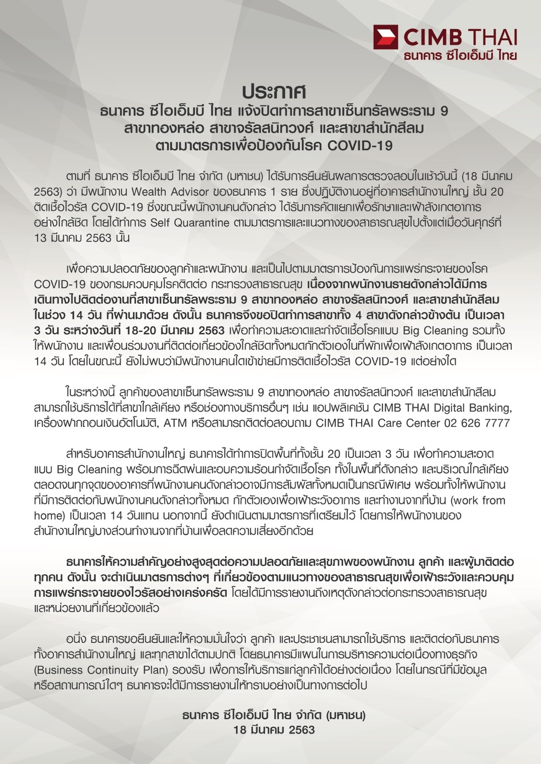 ตามที่ธนาคาร ซีไอเอ็มบี ไทย จำกัด (มหาชน) ได้รับการยืนยันผลการตรวจสอบในเช้าวันนี้ (18 มี.ค.) ว่า มีพนักงาน Wealth Advisor ของธนาคาร 1 ราย ซึ่งปฏิบัติงานอยู่ที่อาคารสำนักงานใหญ่ ชั้น 20 ติดเชื้อ COVID-19 ซึ่งขณะนี้พนักงานคนดังกล่าวได้รับการคัดแยกเพื่อรักษาและเฝ้าสังเกตอาการอย่างใกล้ชิด โดยได้ทำการ Self Quarantine ตามมาตรการและแนวทางของสาธารณสุขตั้งแต่เมื่อวันศุกร์ที่ 13 มีนาคม 2563 นั้น เพื่อความปลอดภัยของลูกค้าและพนักงาน และเป็นไปตามมาตรการป้องกันการแพร่กระจายของโรค COVID-19 ของกรมควบคุมโรคติดต่อ กระทรวงสาธารณสุข เนื่องจากพนักงานรายดังกล่าวได้มีการเดินทางไปติดต่องานที่สาขาเซ็นทรัลพระราม 9 สาขาทองหล่อ สาขาจรัลสนิทวงศ์ และสาขาสำนักสีลม ในช่วง 14 วันที่ผ่านมาด้วย ดังนั้น ธนาคารจึงขอปิดทำการสาขาทั้ง 4 สาขาดังกล่าวข้างต้น เป็นเวลา 3 วัน ระหว่างวันที่ 18-20 มีนาคม 2563 เพื่อทำความสะอาดและกำจัดเชื้อโรคแบบ Big Cleaning รวมทั้งให้พนักงาน และเพื่อนร่วมงานที่ติดต่อเกี่ยวข้องใกล้ชิดทั้งหมด กักตัวเองในที่พักเพื่อเฝ้าสังเกตอาการเป็นเวลา 14 วัน โดยขณะนี้ยังไม่พบว่ามีพนักงานคนใดเข้าข่ายมีการติดเชื้อไวรัส COVID-19 แต่อย่างใด