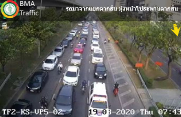 กทม. 19 มี.ค.-สวพ.FM91 รายงานจราจรเช้าวันพฤหัสบดี สะพานสมเด็จพระเจ้าตากสิน ขาเข้า ติดขัด ท้ายแถวสะสมหน้าอาคารสินสาธรทาวเวอร์